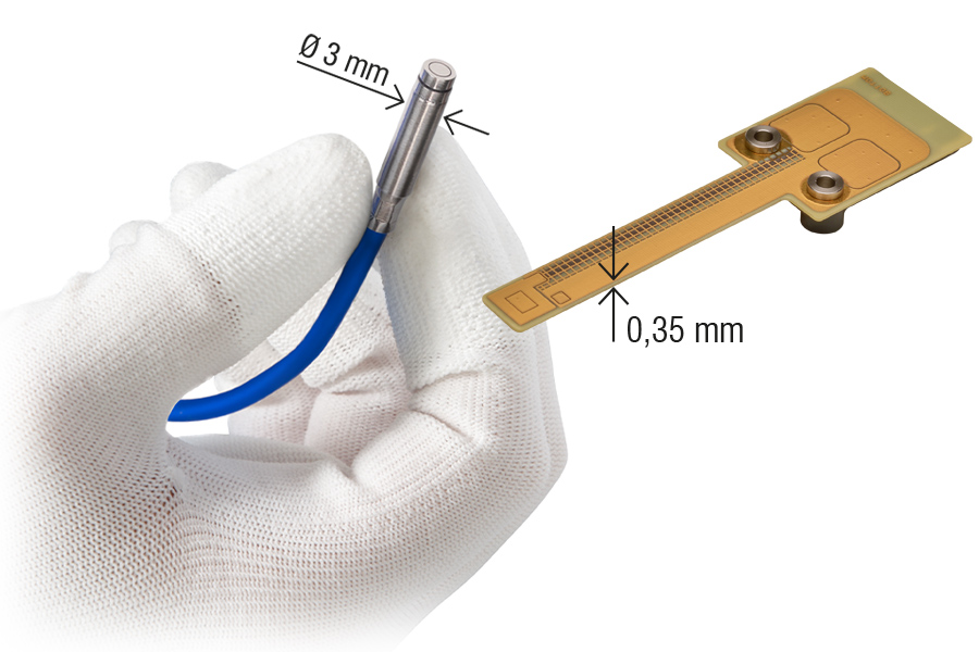 Micro-Epsilon offers extremely compact capacitive sensors for integration in confined spaces. Whether cylindrical sensors with a diameter of only 3 mm, very flat sensors with a thickness of 0.35 mm or flexible PCB versions, hardly any space is required at the measuring point. In addition, the measuring range starts directly at the sensor, which saves additional installation space.
