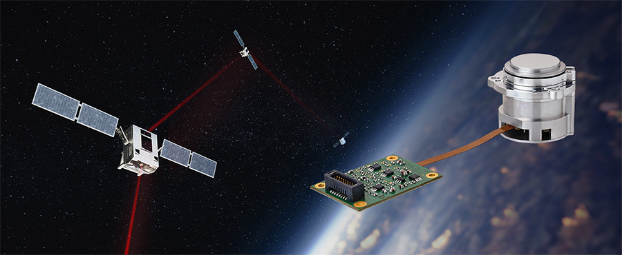 These dynamic systems use high-precision eddy current displacement sensors and a supremely flat mirror, which is moved by an actuator in the form of two electromagnetic coils per tilting axis. The Fast Steering Mirror can be controlled extremely precisely along two axes. A central pivot point allows synchronous movement without play or wear. The FSM3000 tilting mirror systems stand out with their robustness, compact design and low weight of around 55 g. The mirror itself is roughly the size of a table tennis ball. This makes them not only easy to integrate, but also extremely resilient. This means that tilting mirror systems in satellites can easily withstand the strong shocks and vibrations during rocket launches and work very precisely and reliably in orbit.